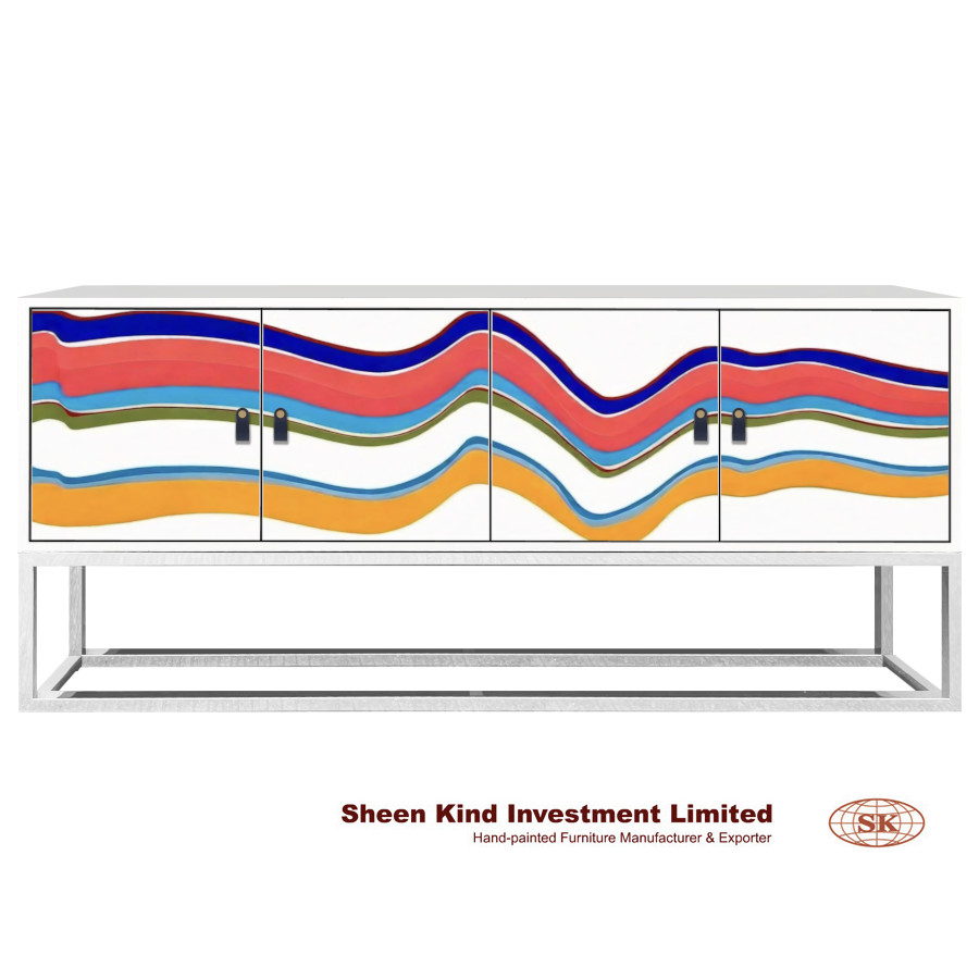 Waves Sideboard 65"L x 18"W x 31"H Material: Solid wood, engineered hardwood & stainless steel Dynamic lines and hues dance across the sideboard like a joyful river Four doors with interior shelves provide ample storage space Genuine leather pulls in black finish Painted semi-gloss soft white finish Stainless steel frame with brushed finish