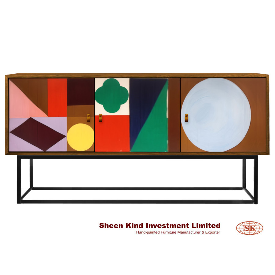 Country Style Sideboard 69"L x 18"W x 35"H Material: Solid wood, wood veneers, engineered hardwood & metal Dive into a world of color and form with this stunning sideboard piece that captures the essence of country charm A vibrant orchestration of geometric forms against rich, earthy tones hand-painted by our artisans Three doors with interior shelves provide ample storage space Metal frame in matte black finish Genuine leather pulls in brown finish