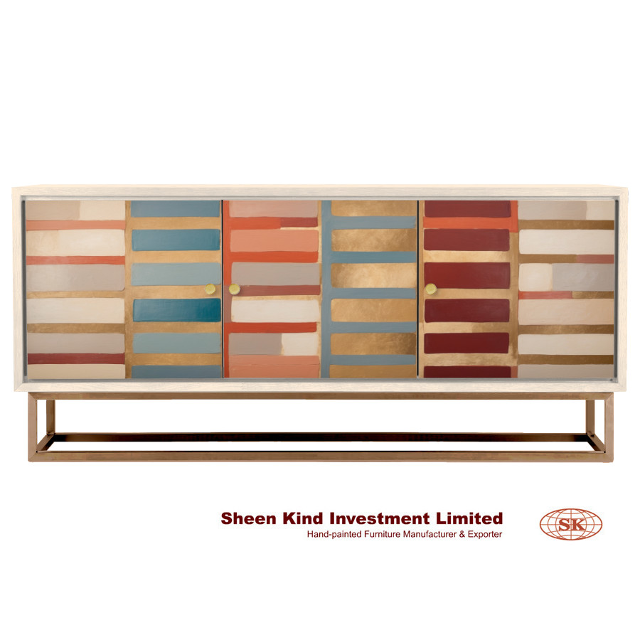 Abstract Sideboard 60"L x 18"W x 30"H Material: Solid wood, wood veneer, engineered hardwood & metal Add a splash of color to your home with this stunning sideboard! The playful squares and rectangles is the perfect statement piece Geometric design hand-painted by our artisans Metal base in gold tone finish Painted semi-gloss ivory white finish