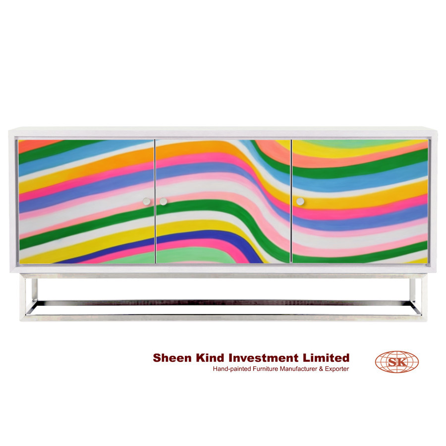 Rainbow Sideboard 60"L x 18"W x 30"H Material: Solid wood, wood veneer, engineered hardwood & stainless steel An abstract symphony of color, where vibrant stripes interweave in a dance of cheerful hues, this sideboard is a celebration of movement and energy Mesmerizing wave-patterned design hand-painted by our artisans Stainless steel base in brushed finish Painted semi-gloss soft white finish