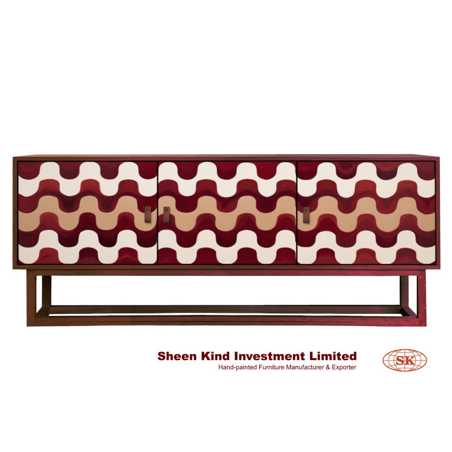 Wave Sideboard 71"L x 18"W x 29"H Material: Solid wood, wood venners & engineered hardwood The rigid geometry of the undulating pattern in deep burgundy, cream, and muted tan, this sideboard is perfect for adding warmth and character to your living area Interlocking waves pattern hand-painted by our artisans Three doors with interior shelves provide ample storage space Painted burgundy finish Genuine leather door pulls