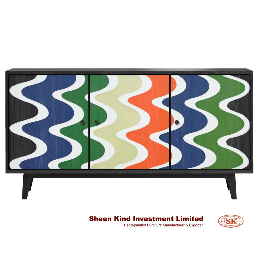 Waves Sideboard 64"L x 18"W x 33"H Material: Solid wood, wood veneers & engineered hardwood Exploring the vibrant interplay between deep blues, lush greens, and striking orange, framed by crisp white borders. This sideboard is a testament to mid-century modern aesthetic precision Undulating bands of bold color hand-painted by our artisans Three doors with interior shelves provide convenient ample storage Painted semi-gloss black finish