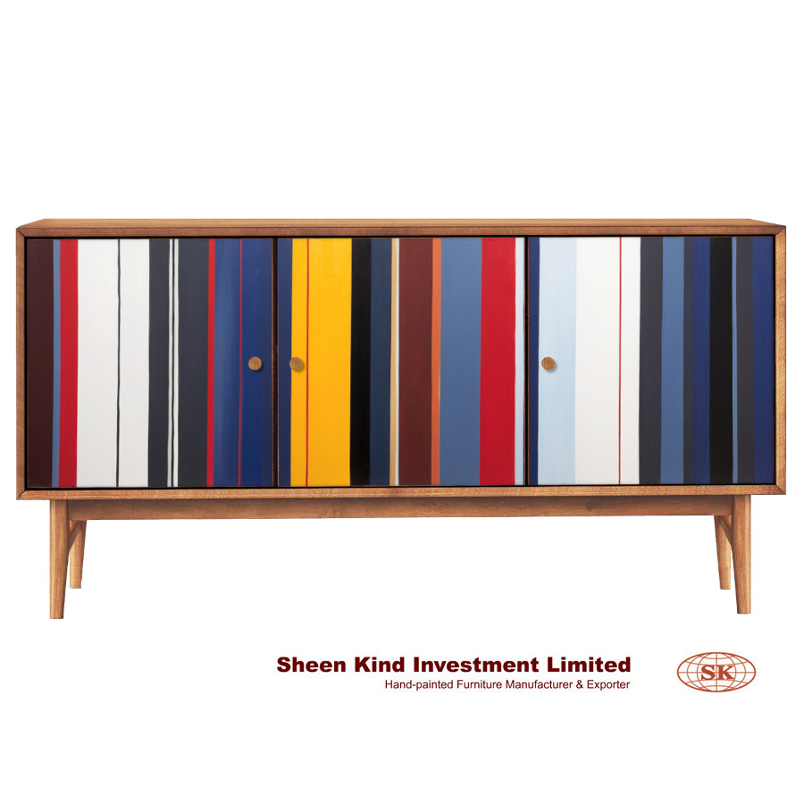 Stripe Sideboard 62"L x 18"W x 32"H Material: Solid wood, wood veneers & engineered hardwood Elevating the aesthetic of any interior space, this sideboard serves as a commanding focal point, fusing modern design with fine art principles Bold stripe pattern hand-painted by our artisans Three doors with interior shelves provide convenient ample storage Painted pine finish