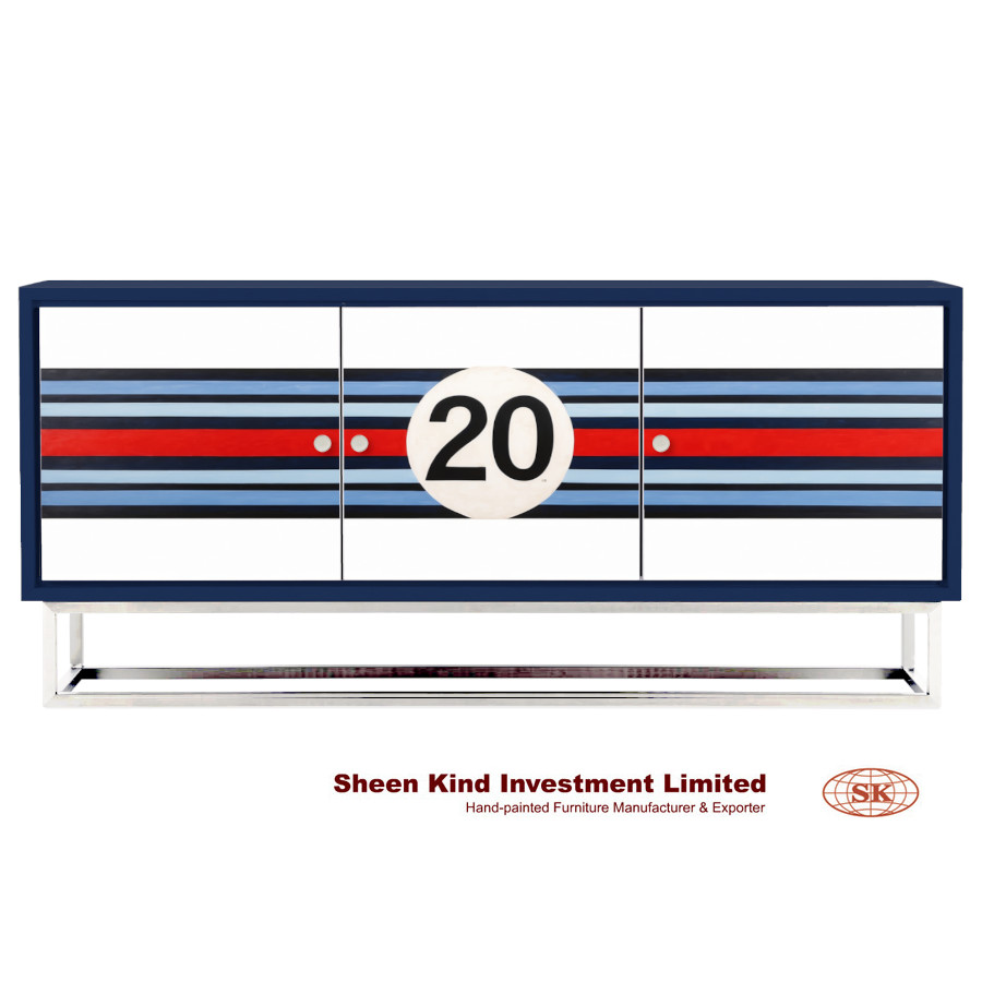 Racing Heritage Sideboard 60"L x 18"W x 30"H Material: Solid wood, wood veneer, engineered hardwood & stainless steel The definitive aesthetic of victory, this sideboard captures the essence of speed and motorsport heritage Iconic racing livery hand-painted by our artisans Stainless steel base in brushed finish Painted semi-gloss navy blue finish