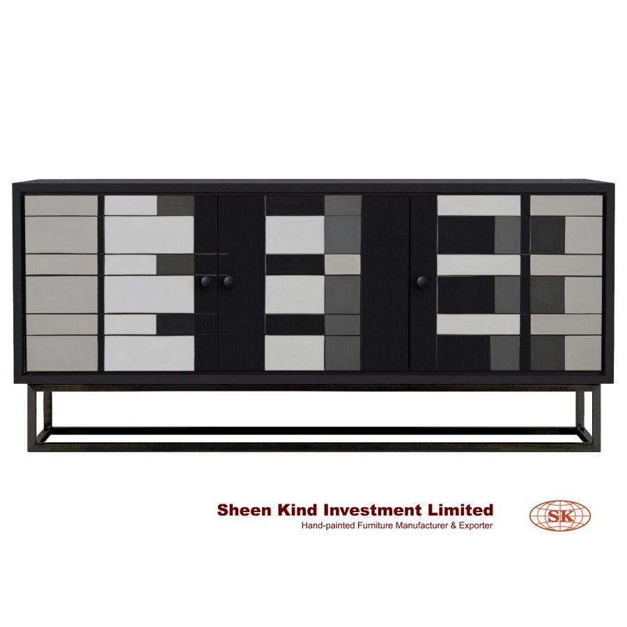 Abstract Sideboard 60"L x 18"W x 30"H Material: Solid wood, wood veneer, engineered hardwood & metal A study in monochrome geometry: the precise alignment of squares and rectangles on this sideboard captures the beauty of contrasts Black, grey and white windows hand-painted by our artisans Metal base in matte black finish Painted semi-gloss black finish