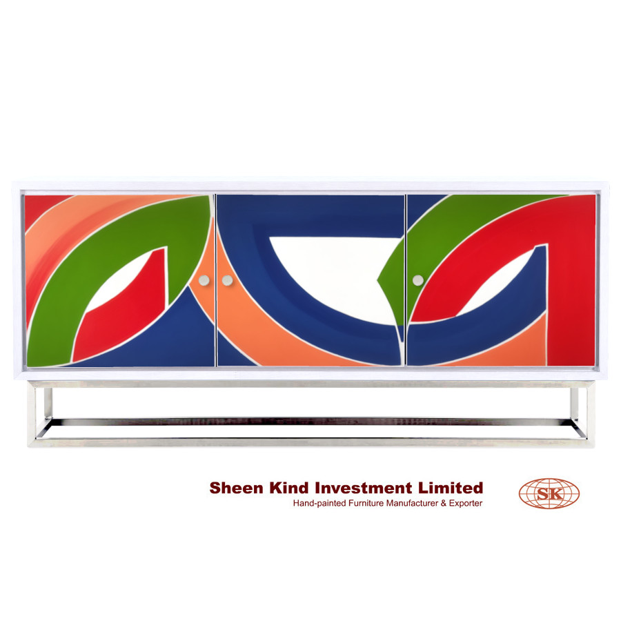 Abstract Sideboard 60"L x 18"W x 30"H Material: Solid wood, wood veneer, engineered hardwood & stainless steel A perfect statement piece for any room, the elegant interplay of curving forms and sharp geometric incisions defines this compelling modern sideboard Eye-catching bold geometry design featuring vibrant red, green, and blue hues Stainless steel base in brushed finish Painted semi-gloss soft white finish
