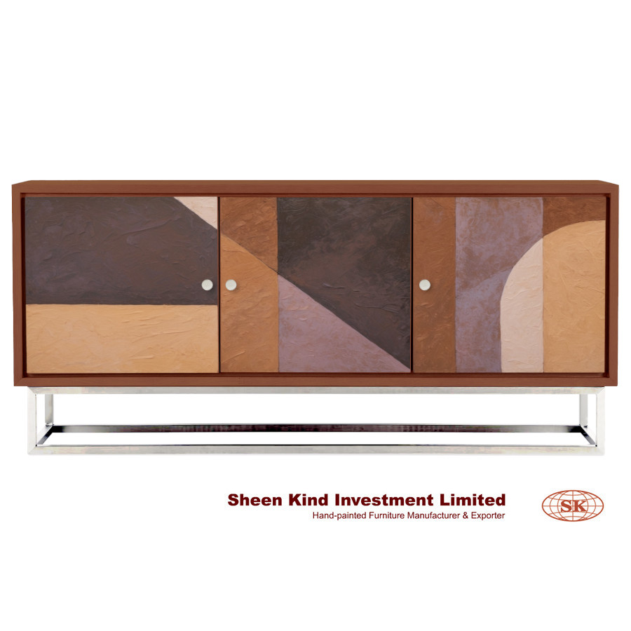 Abstract Sideboard 60"L x 18"W x 30"H Material: Solid wood, wood veneer, engineered hardwood & stainless steel Elevate your space with this art-inspired sideboard featuring geometric forms in rich earthy tones. Perfect for adding warmth to any room Abstract design painted in rich brown, purple, and orange Stainless steel base in brushed finish Painted semi-gloss walnut finish
