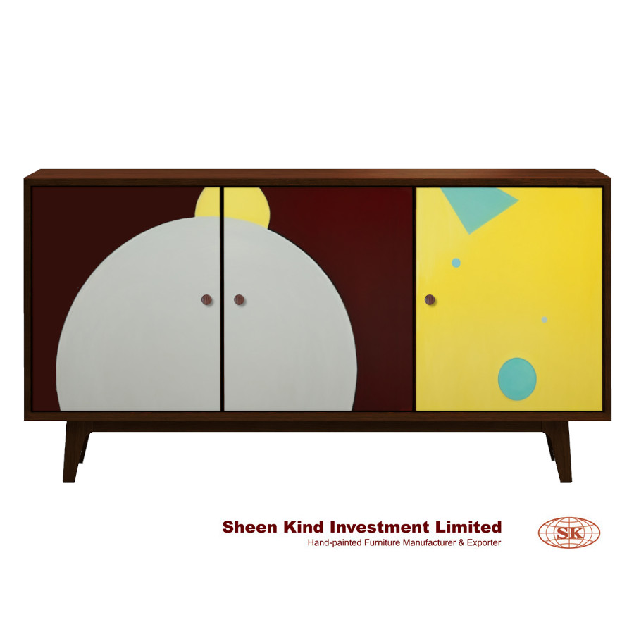 Geometric Sideboard 64"L x 18"W x 33"H Material: Solid wood, wood veneers & engineered hardwood Transform your space with the bold energy of geometric art! The vibrant abstract pattern on this sideboard is not just a feast for the eyes but also a reminder to embrace the beauty in simplicity An abstract composition exploring geometric harmony: the subtle luminescence of the sphere contrasts dynamically with the vibrant yellow plane Three doors with interior shelves provide convenient ample storage Painted dark walnut finish