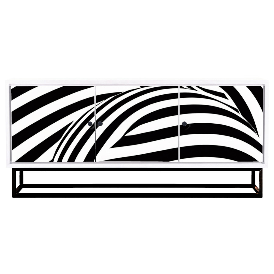Op Art Sideboard 60"L x 18"W x 30"H Material: Solid wood, wood veneer, engineered hardwood & metal Dive into the depth of Op Art with this sideboard where simple geometry yields complex, mesmerizing spatial illusions Monochromatic pattern design hand-painted by our artisans Metal base in matte black finish Painted semi-gloss soft white finish