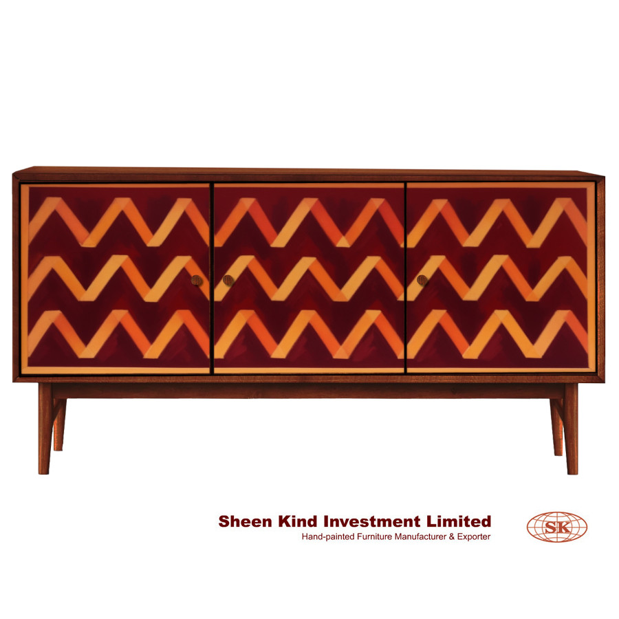 Herringbone Sideboard 62"L x 18"W x 32"H Material: Solid wood, wood veneers & engineered hardwood Add a splash of warmth to your home with this beautiful yellow and orange striped sideboard Classic herringbone pattern hand-painted by our artisans Three doors with interior shelves provide convenient ample storage Painted walnut finish