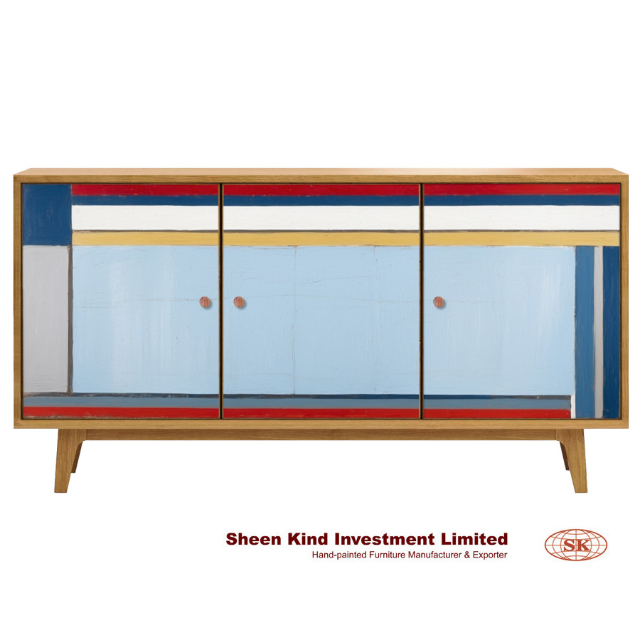 De Stijl Sideboard 64"L x 18"W x 33"H Material: Solid wood, wood veneers & engineered hardwood Inspired by the De Stijl movement, this sideboard featuring vibrant stripes is the perfect statement piece for your home Geometric abstraction pattern hand-painted by our artisans Three doors with interior shelves provide convenient ample storage Painted pine finish