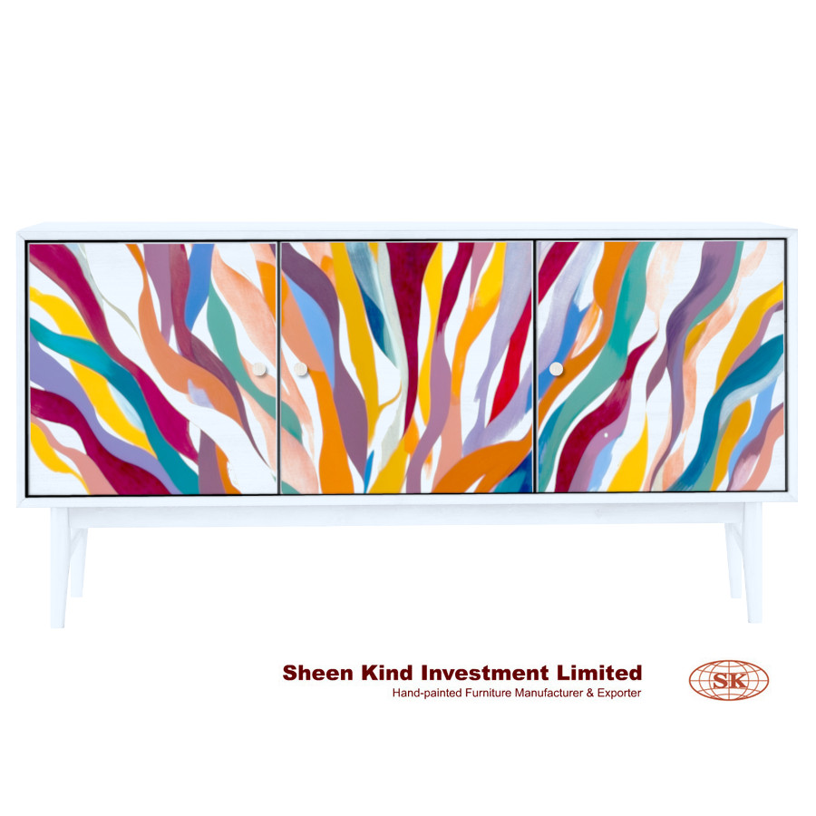 Floral Sideboard 62"L x 18"W x 32"H Material: Solid wood, wood veneers & engineered hardwood Dive into a world of color with this stunning floral sideboard! The interplay of hues against a white background brings a fresh perspective to nature's beauty Exotic floral design hand-painted by our artisans Three doors with interior shelves provide convenient ample storage Painted semi-gloss white finish