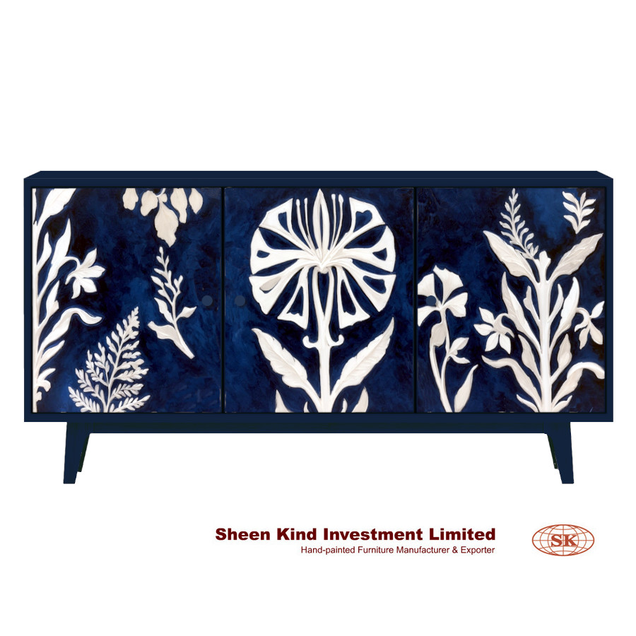 Botanical Sideboard 64"L x 18"W x 33"H Material: Solid wood, wood veneers & engineered hardwood This captivating sideboard with ivory botanical motifs embodies elegance and artistry, perfect for those who appreciate the beauty of nature in their space Blue and white floral design hand-painted by our artisans Three doors with interior shelves provide convenient ample storage Painted indigo blue finish