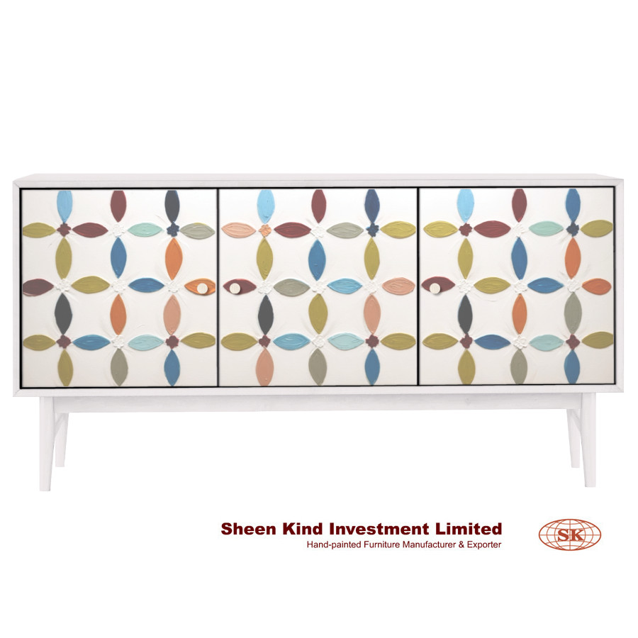 Tessellation Sideboard 64"L x 18"W x 33"H Material: Solid wood, wood veneers & engineered hardwood This charismatic buffet sideboard piece will easily find the perfect spot in your home with its boho-inspired jewel-toned tessellation pattern A recurring geometric motif hand-painted by our artisans Three doors with interior shelves provide ample storage space Painted soft white finish