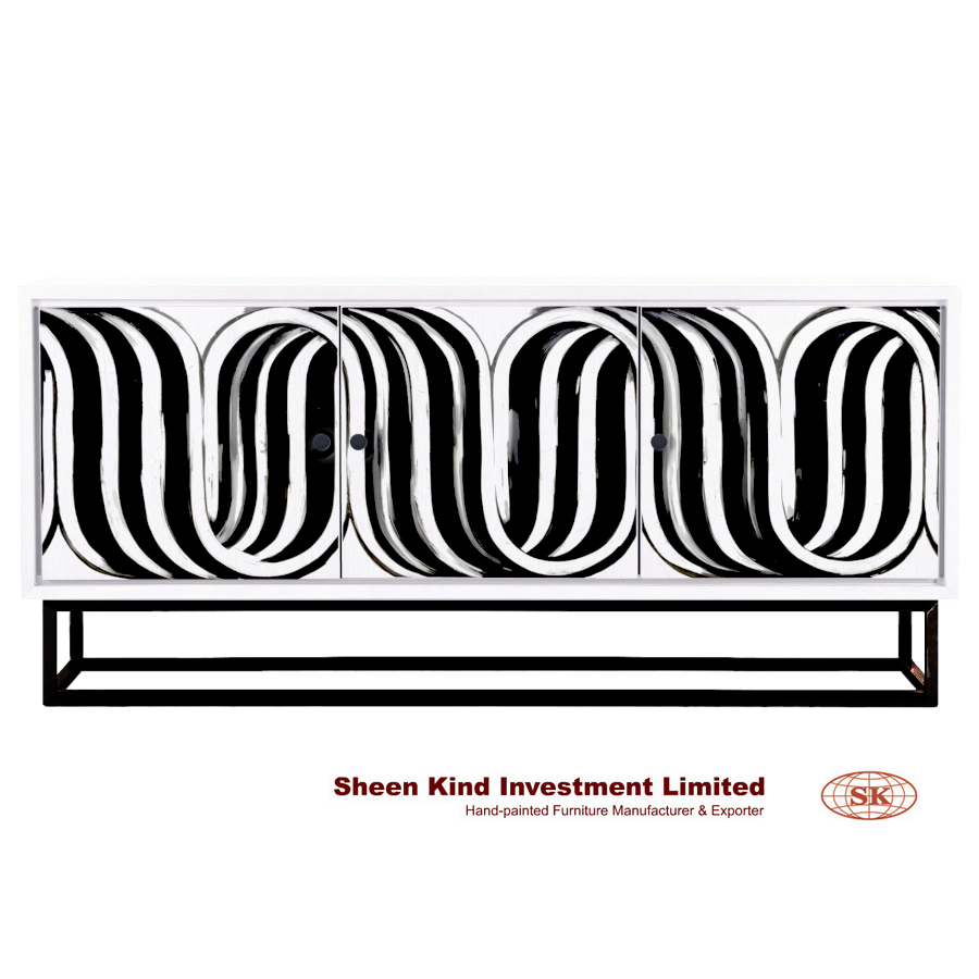Wave Sideboard 60"L x 18"W x 30"H Material: Solid wood, wood veneer, engineered hardwood & metal This captivating sideboard of rhythmic undulation of stark black and white lines creates a compelling visual cadence Monochromatic wave pattern hand-painted by our artisans Metal base in matte black finish Painted semi-gloss soft white finish