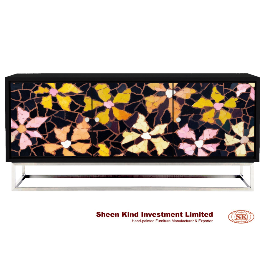 Floral Sideboard 60"L x 18"W x 30"H Material: Solid wood, wood veneer, engineered hardwood & stainless steel Immerse yourself in a vibrant world with this sideboard featuring colorful mosaic of flowers! Perfect for adding a pop of color to any space Bold yellow and pink flowers hand-painted by our artisans Stainless steel base in brushed finish Painted semi-gloss black finish