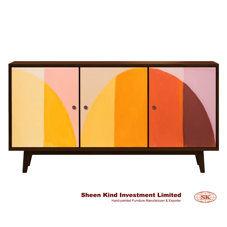 Abstract Sideboard 64"L x 18"W x 33"H Material: Solid wood, wood veneers & engineered hardwood Dive into a world of vibrant hues with this stunning abstract sideboard! The blend of orange, yellow, and pink creates a warm embrace that brightens any space Eye-catching abstract design hand-painted by our artisans Three doors with interior shelves provide convenient ample storage Painted dark walnut finish
