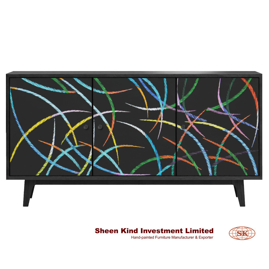 Abstract Sideboard 64"L x 18"W x 33"H Material: Solid wood, wood veneers & engineered hardwood Transform your living area with this captivating sideboard of colorful feathers on a bold charcoal finish A perfect addition to your furniture collection, it invites creativity and conversation Three doors with interior shelves provide convenient ample storage Painted charcoal finish