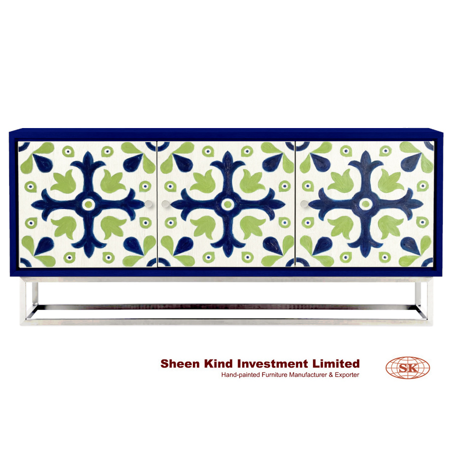 Mediterranean Sideboard 60"L x 18"W x 30"H Material: Solid wood, wood veneer, engineered hardwood & stainless steel This sideboard of intricate design, reminiscent of historic Mediterranean geometric-botanical motif, brings a touch of timeless, artisanal elegance to any space Mesmerizing Mediterranean pattern hand-painted by our artisans Stainless steel base in brushed finish Painted semi-gloss navy finish