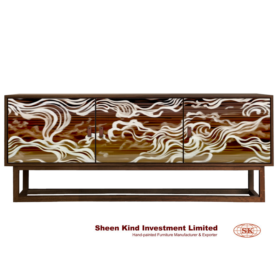 Wave Sideboard 71"L x 18"W x 29"H Material: Solid wood, wood venners & engineered hardwood Dive into the serene world of abstract waves, where earthy browns meet soft whites. This captivating sideboard invites you to explore the depths of creativity Stunning waves pattern in rich brown and white tones hand-painted by our artisans Three doors with interior shelves provide ample storage space Painted walnut finish Genuine leather door pulls
