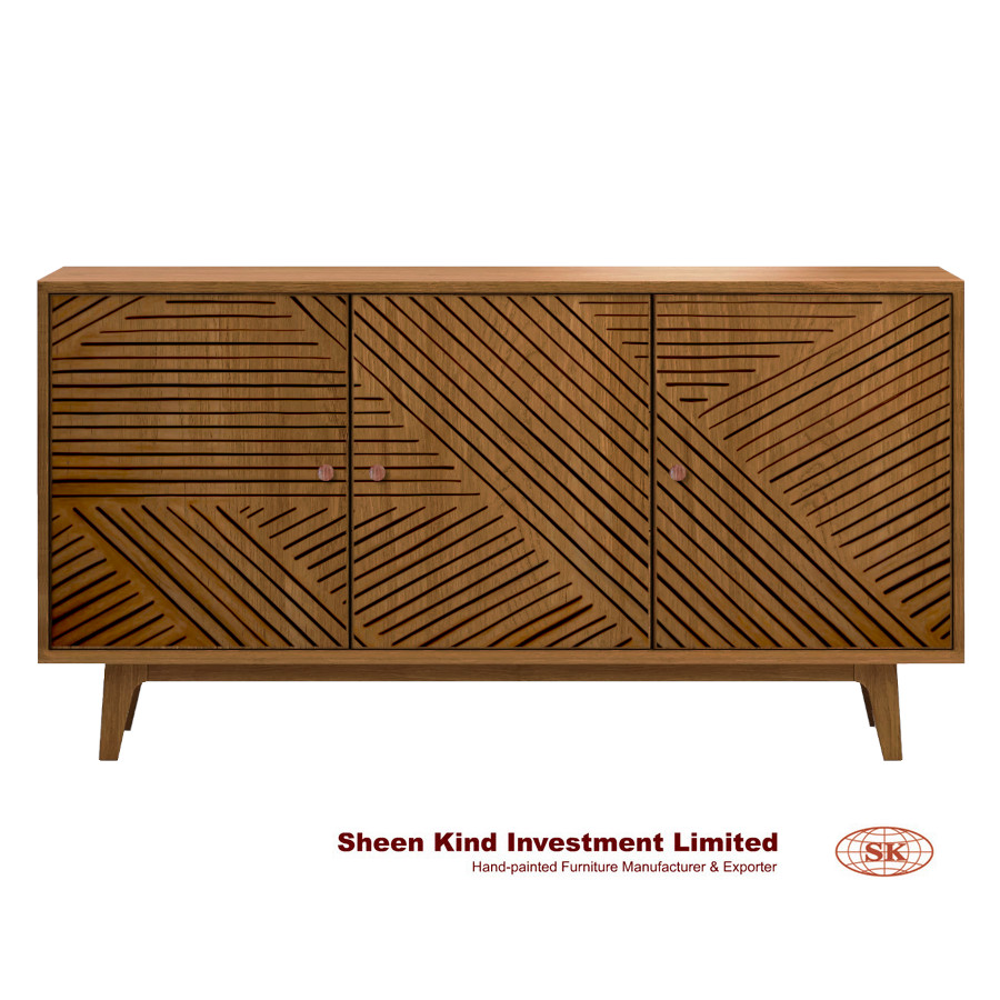 Striped Sideboard 64"L x 18"W x 33"H Material: Solid wood, wood veneers & engineered hardwood The interplay of linear elements on this sideboard generates a sophisticated visual rhythm, demonstrating precision in geometric design Intricate striped patterns hand-painted by our artisans Three doors with interior shelves provide convenient ample storage Painted walnut finish