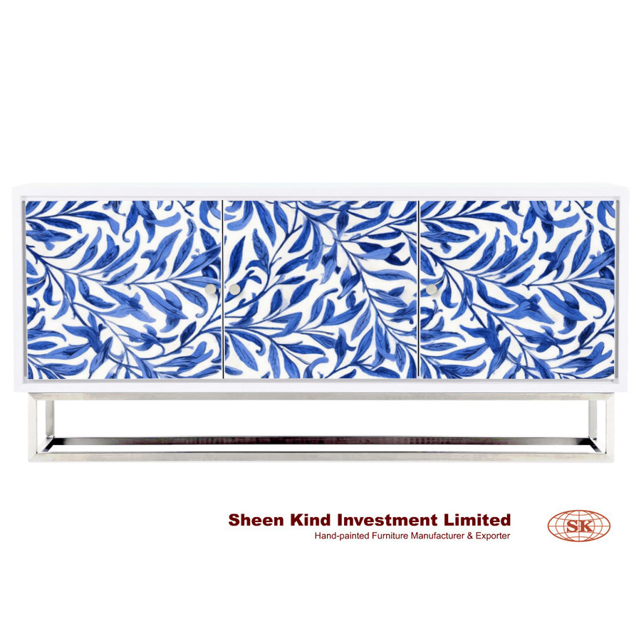 Chinoiserie Tropical Sideboard 60"L x 18"W x 30"H Material: Solid wood, wood veneer, engineered hardwood & stainless steel Embrace the beauty of nature with our Chinoiserie sideboard where the blue and white floral pattern effortlessly blends artistry and design Elegant tropical pattern hand-painted by our artisans Stainless steel base in brushed finish Painted semi-gloss soft white finish