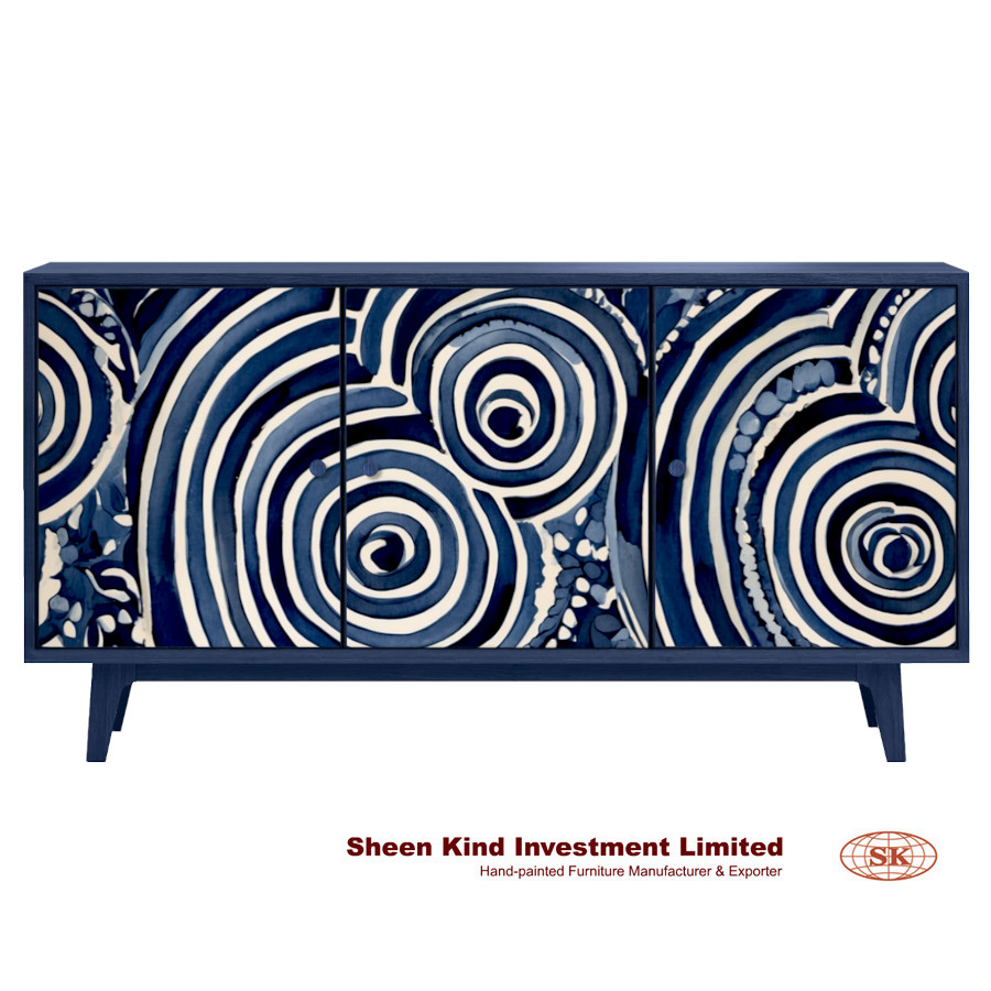Ripple Sideboard 64"L x 18"W x 33"H Material: Solid wood, wood veneers & engineered hardwood Immerse yourself in the beauty of water-inspired patterns! This sideboard showcases intricate designs that reflect the fluidity and grace of water Ripple patterns hand-painted by our artisans Three doors with interior shelves provide convenient ample storage Painted indigo blue finish
