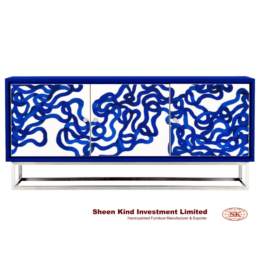 Waves Sideboard 60"L x 18"W x 30"H Material: Solid wood, wood veneer, engineered hardwood & stainless steel Dive into the calming essence of these blue wavy lines, seamlessly blending with this white sideboard. A perfect harmony of movement and simplicity that elevates any space Blue waves hand-painted by our artisans Stainless steel base in brushed finish Painted semi-gloss soft white finish
