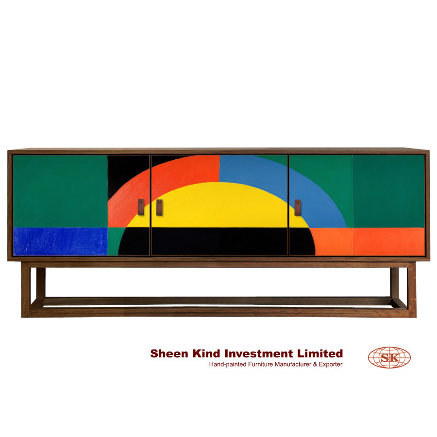 Abstract Sideboard 71"L x 18"W x 29"H Material: Solid wood, wood venners & engineered hardwood The precise intersection of color and geometry creates a dynamic equilibrium in this compelling abstract sideboard Abstract pattern in primary and secondary hues hand-painted by our artisans Three doors with interior shelves provide ample storage space Wooden frame Genuine leather door pulls