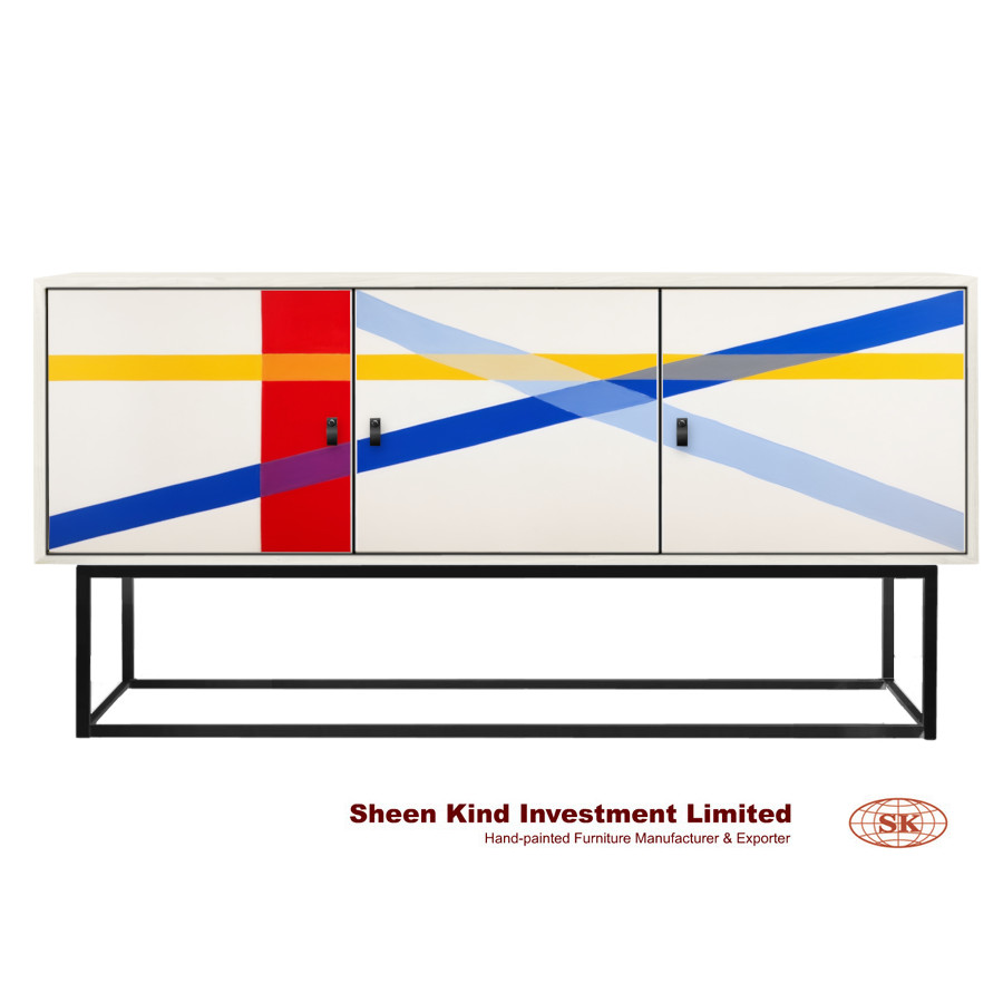 Striped Sideboard 69"L x 18"W x 35"H Material: Solid wood, wood veneers, engineered hardwood & metal This stunning sideboard showcases the beauty of simplicity through its bold blue, yellow, and red lines Overlapping bands of primary and secondary hues hand-painted by our artisans Three doors with interior shelves provide ample storage space Metal frame in matte black finish Painted in soft white finish