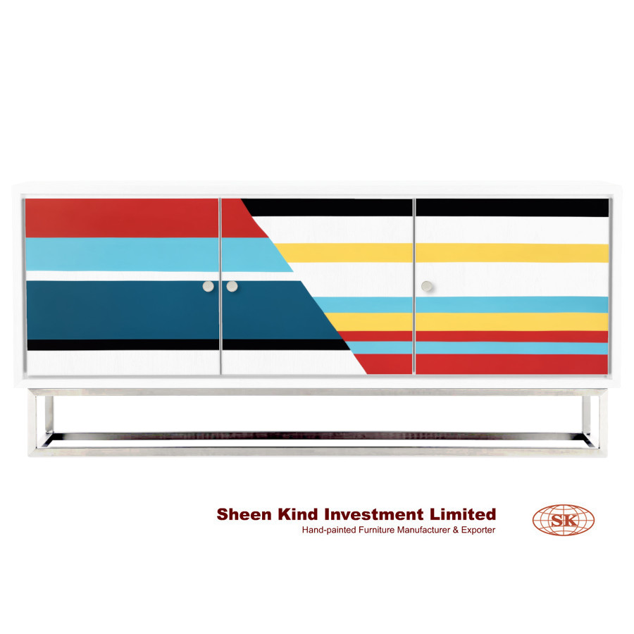 Stripes Sideboard 60"L x 18"W x 30"H Material: Solid wood, wood veneer, engineered hardwood & stainless steel The contrasting lines and shapes on this sideboard create a visual rhythm that invites a touch of artistic flair into your space Eye-catching stripes pattern hand-painted by our artisans Stainless steel base in brushed finish Painted semi-gloss white finish