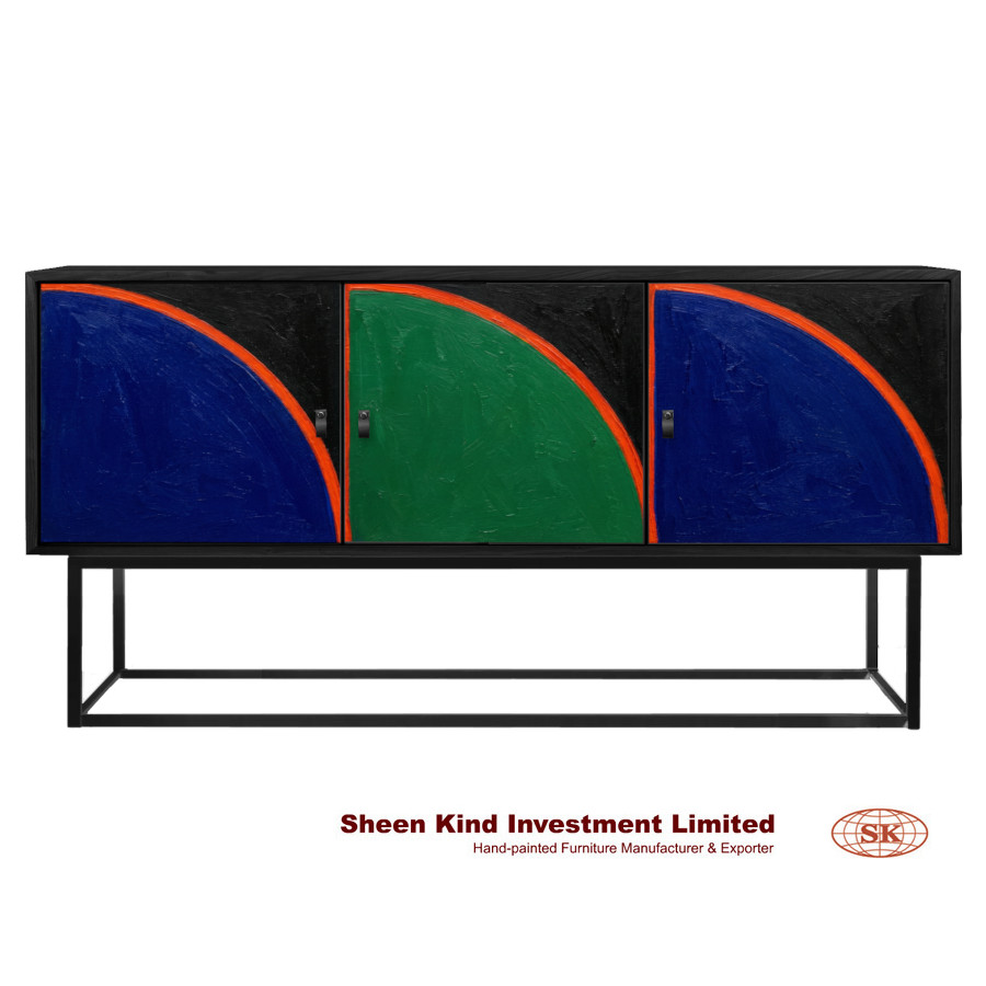 Geometric Sideboard 69"L x 18"W x 35"H Material: Solid wood, wood veneers, engineered hardwood & metal This sideboard features alternating quadrants of blue and green are perfect for adding a vibrant touch to your living space Vibrant coral curve pattern hand-painted by our artisans Three doors with interior shelves provide ample storage space Metal frame in matte black finish Painted in semi-gloss black finish