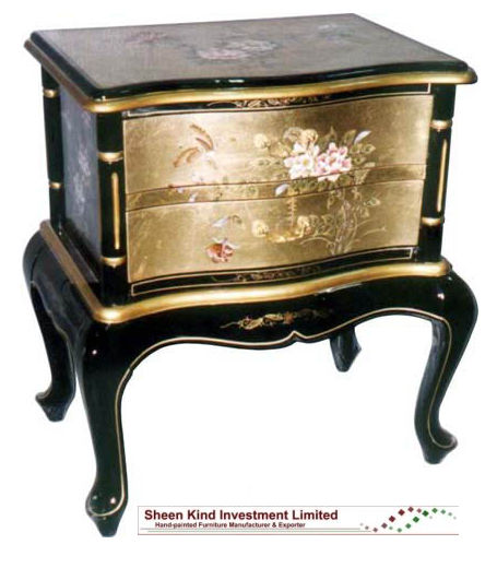 Side Table with Gold Leaf Finish 24" x 16" x 28"H Material: Hardwood & Engineered Wood Hand-painted scenes of flowers and birds atop an impressive layer of gold leaf. Beautiful high sheen lacquer finish completes the look. 2 drawers provide ample storage space for accessories. Antique brass finish hardware.